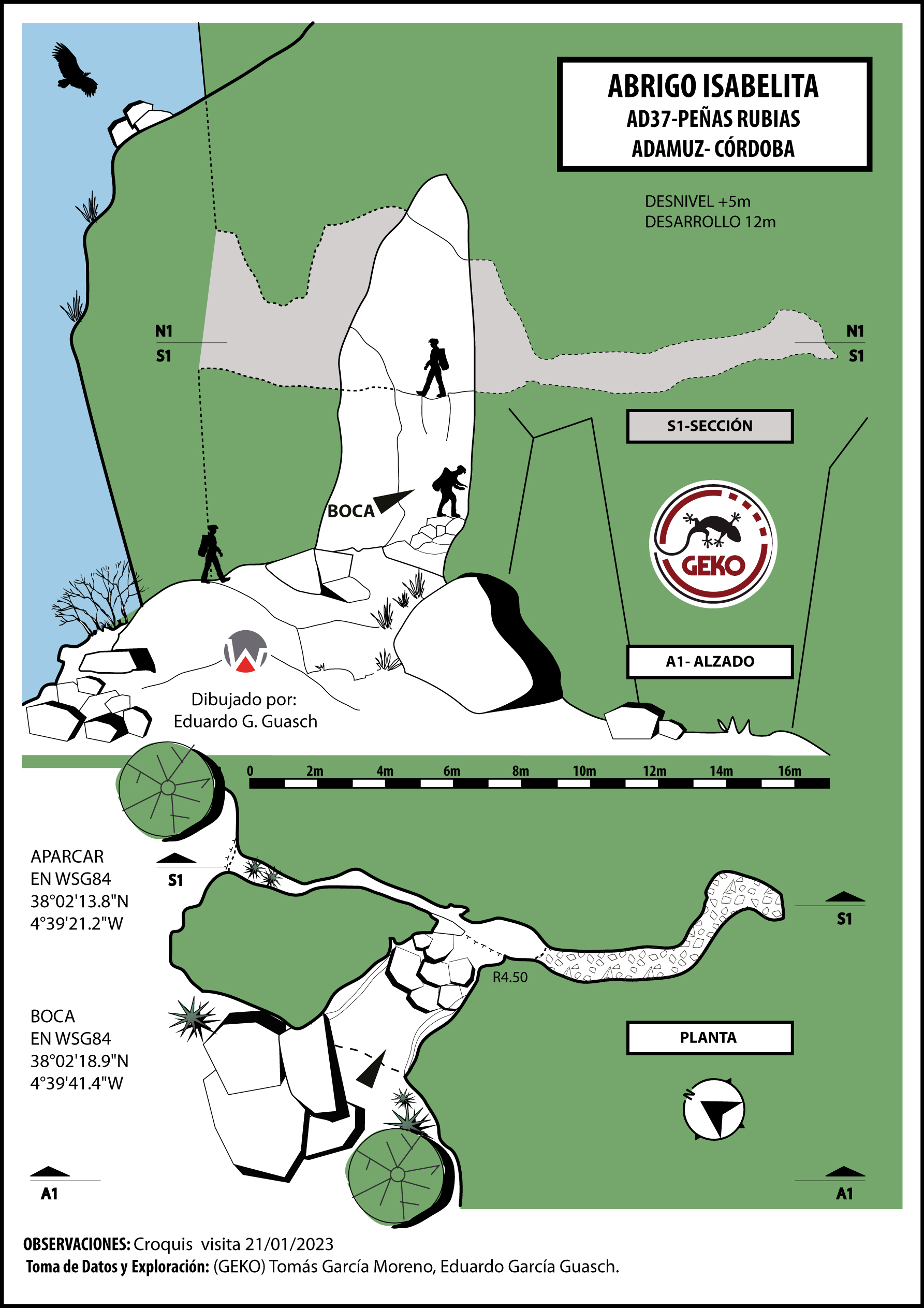 En su afán por dejar cuevas catalogada, registradas y con una información completa Grupo Espeleológico Kart-Oba (GEKO) se acerca a Peñas Rubias en Adamuz. Les habían hablado de un abrigo. A raíz de la visita realiza un informe y la deja registrada en CATFAE bajo el nombre de Abrigo Isabelita, ya que hemos podido hablar con la mujer que en 1945 había dejado su marca allí.
